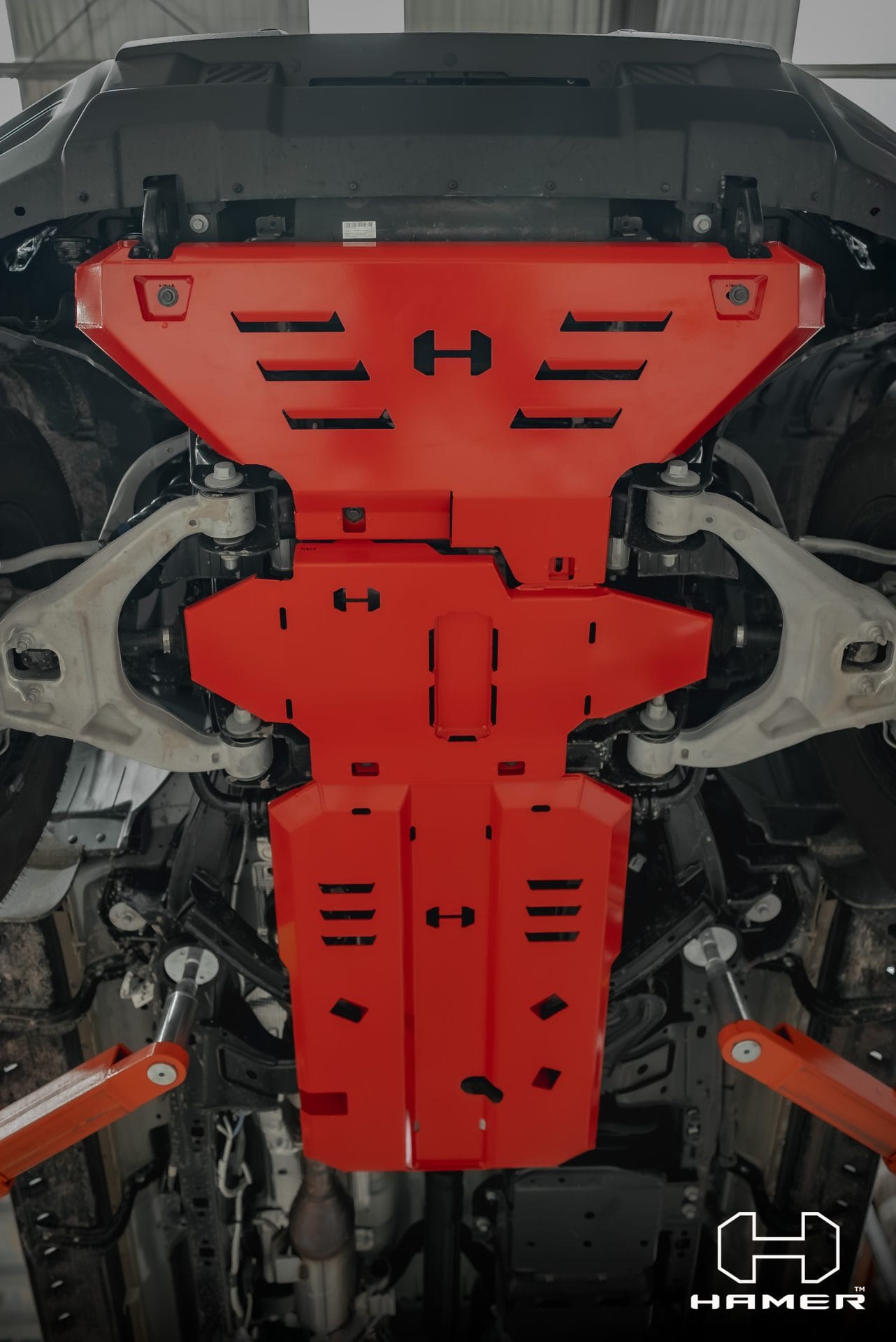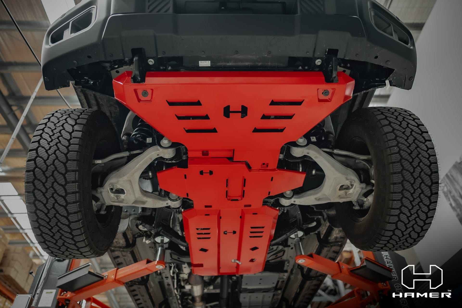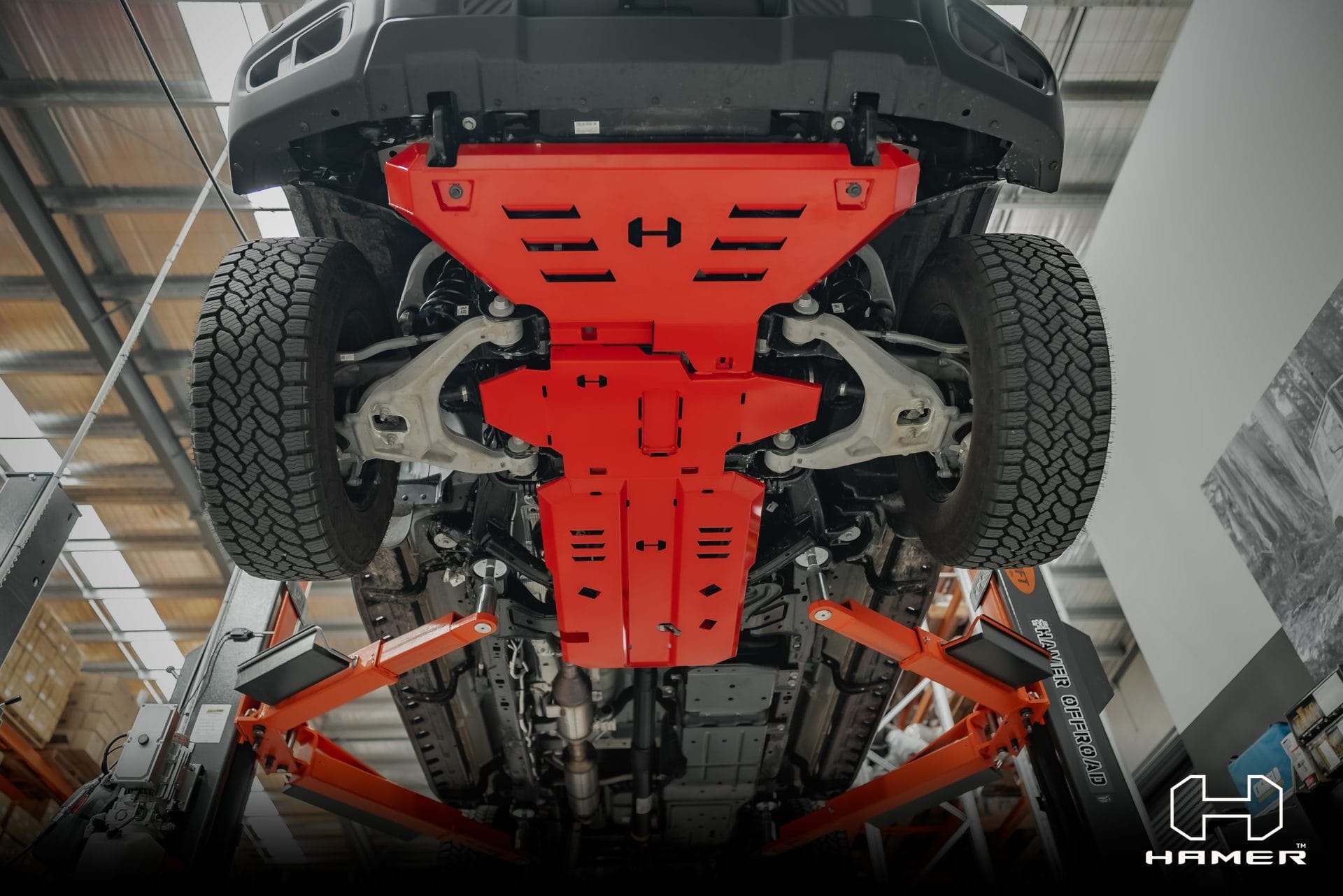 Introducing the Hamer 4×4 3-Piece Under Protection Plate for Ford Ranger SuperDuty (2025 – Present), the ultimate shield for your off-road adventures. Crafted from robust 3mm high-grade steel plate and finished with a durable red powder coating, these underbody protection plates are designed to safeguard your vehicle’s vulnerable radiator during rugged off-road journeys. With its slim profile, it ensures excellent clearance and allows easy access to the engine oil drain plug.
